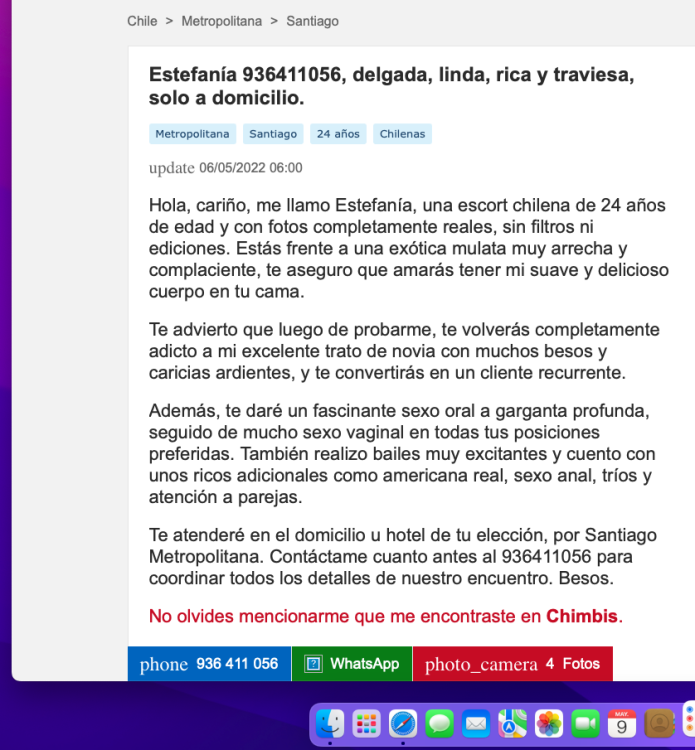 De hot la contacte obvio para ver y coordinar 1. Mensaje aut de respuesta 2 para hablar y saber q es ella hay q pagar 3 dices no y te manda audio tratándose de payaso y sin plata 4 le dije que parecía taxi, y según ella la ofendí O sea evitar a toda costa, o te acosaran Es de m monto extranjera y obvio regentada por el grupo de sinverguenza. MINIMO hace servicio y ya sabiendo tus dato sempieza el cueteo y extorsion. SIEMPRE googlear numeros.Manuel montt noche, mensaje aut de repuest,a cuenta empresa empresa... ni que decir la reputacion de los regentes alli.-..la rucia que mueve los depas...solo para parapentistas sinparapente.